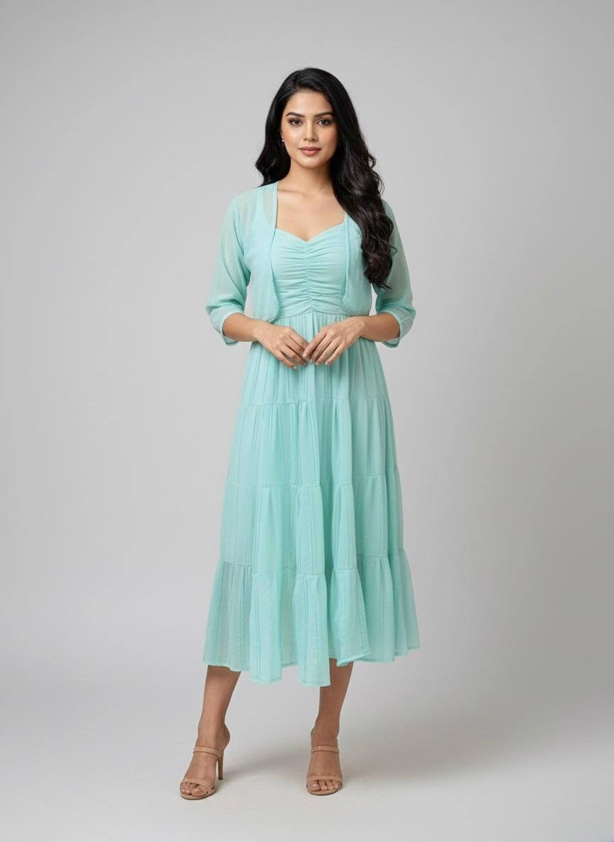 Serene Aqua Mint Tiered Midi Dress with Sheer Matching Shrug