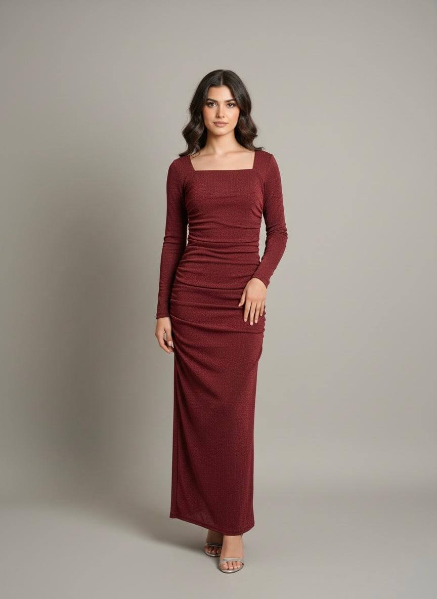 Crimson Night Shimmer Maxi Gown – Square Neck Ruched Bodycon Dress