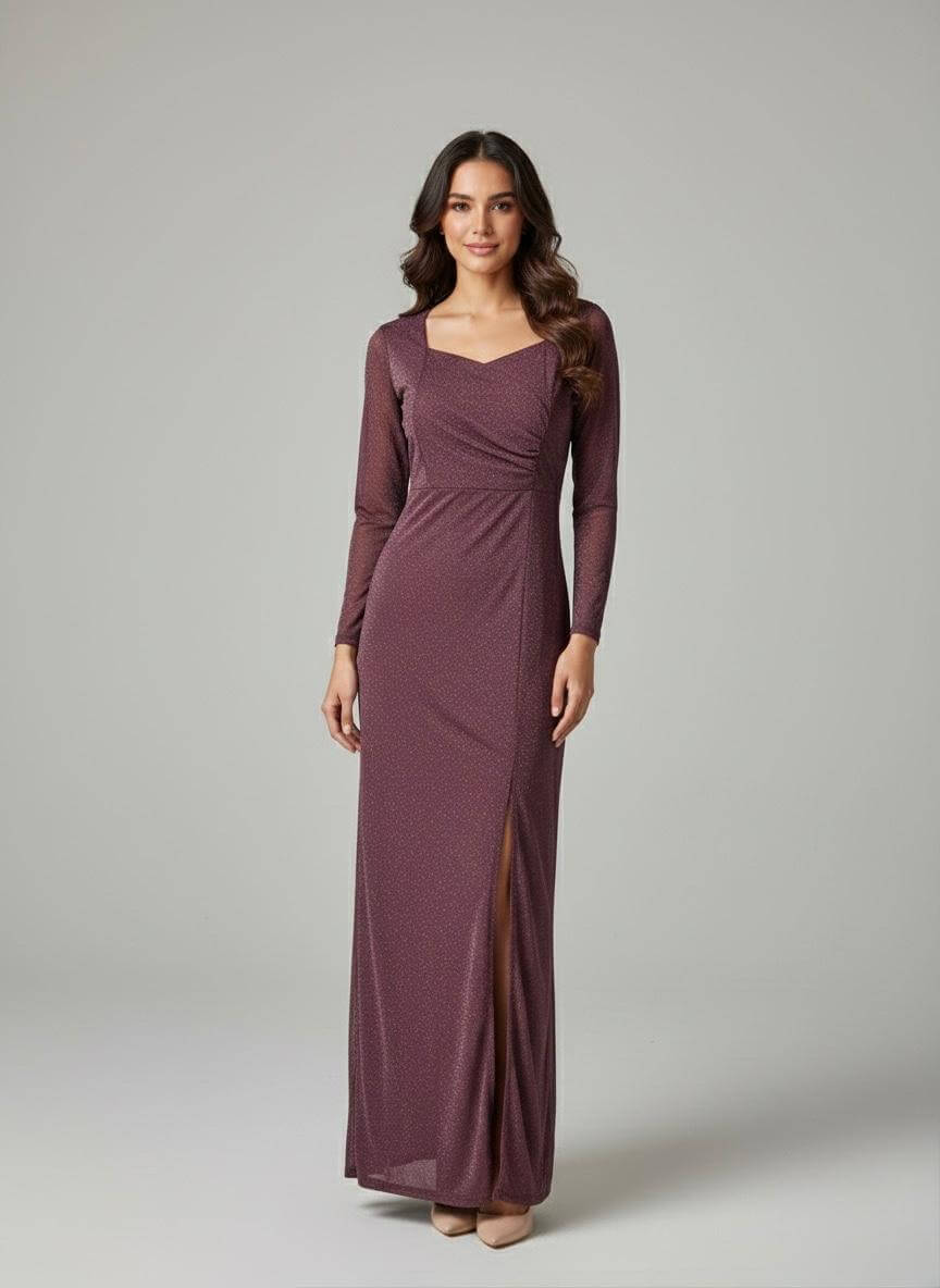 tep into the spotlight with our Ethereal Mauve Glitter Long-Sleeve Maxi Dress. This stunning floor-length gown is designed for the woman who wants to shine, featuring a subtle yet captivating shimmer throughout the fabric that catches the light with every movement. The sophisticated mauve hue offers a modern, romantic alternative to classic evening colors, making it a standout choice for formal occasions.