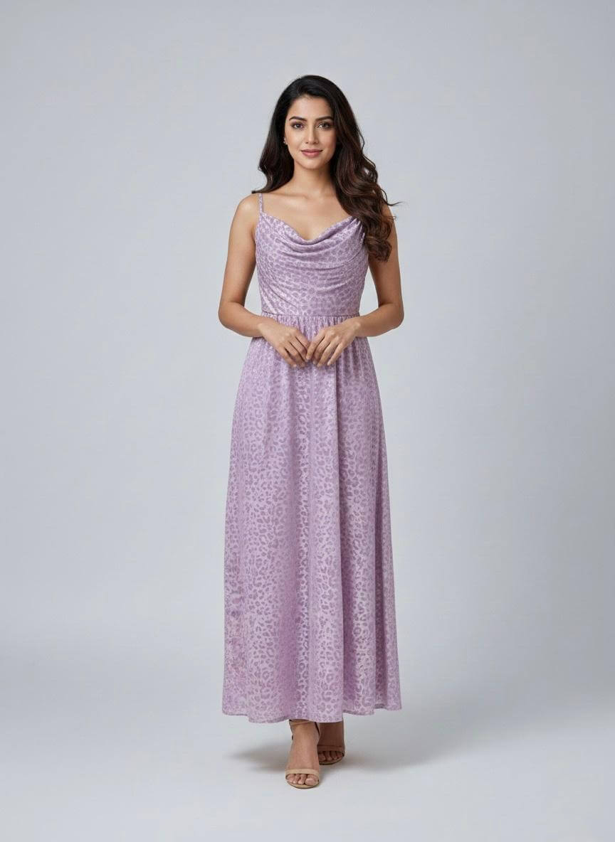 Redefine modern glamour with our Lilac Leopard Frock Dress. This stunning piece takes the classic animal print and reimagines it in a soft, ethereal lavender palette. Featuring a sophisticated cowl neckline and delicate spaghetti straps, it offers a liquid-like silhouette that moves beautifully from cocktail hour to the dance floor.